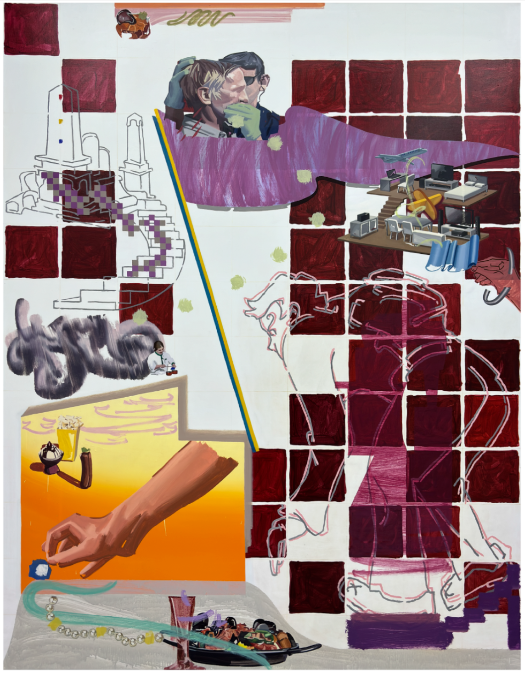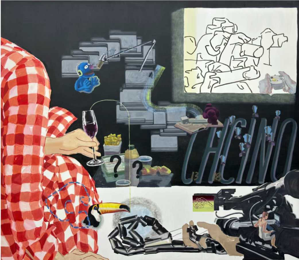 Tang Shaohan is wary of establishing a coherent visual expression at the recognition level. Instead, he meticulously constructs labyrinthine storytelling and layered syntax. Diverging from cinematic montage, in his paintings, clusters of objects can simultaneously appear on the flat surface, granting viewers the freedom to choose their reading sequence. Equally